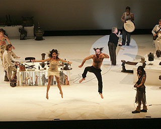 Lydia, nel suo tubino aderente nero appena aperto sul fondo schiena come la vecchia pubblicità del Martini, entra ancheggiando e cantando nella sua splendida intonazione soffice e sontuosa, intensa e sentita, sensualissima, accavallando le gambe come Sharon Stone in “Basic Instinct”, si miscela con Carlota in mutande ed ali da angelo che quasi muore soffocata, tossente, aggozzata inghiottendo un acino d’uva in una mossa che a prima vista doveva sembrare intrigante. E’ un magma in continuo